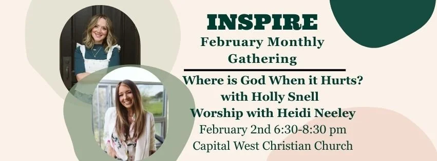 Join INSPIRE on Monday, February 2nd for our February INSPIRE Gathering! We will gather at Capital West Christian Church. Doors open at 6:30 for snacks and fellowship. Program begins at 7:00.